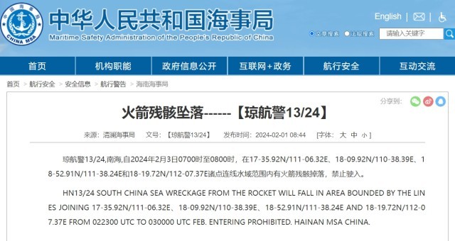 央视网消息:据中国海事局网站消息,清澜海事局发布航行警告,2月3日7时至8时,南海部分海域有火箭残骸掉落,禁止驶入。