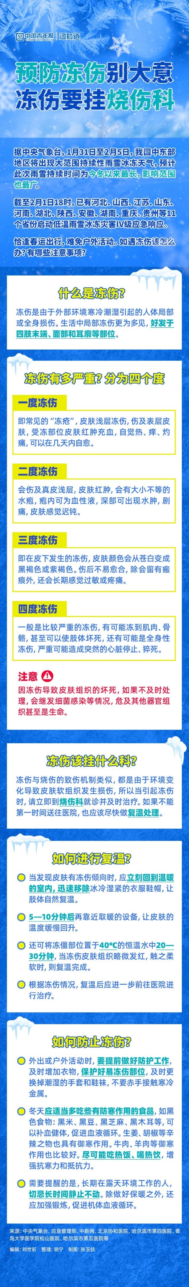 2月1日,中央气象台发布冰冻橙色预警。据预报,这是2009年以来冬季最强雨雪冰冻天气,预计将持续6天,10省份将出现暴雪或大暴雪。恰逢春运出行,在旅途中也要谨防冻伤。如遇冻伤该怎么办?如何紧急补救?想要就医该挂什么科室?转发收藏,祝福大家平安祥和迎春到,开心顺利过大年。