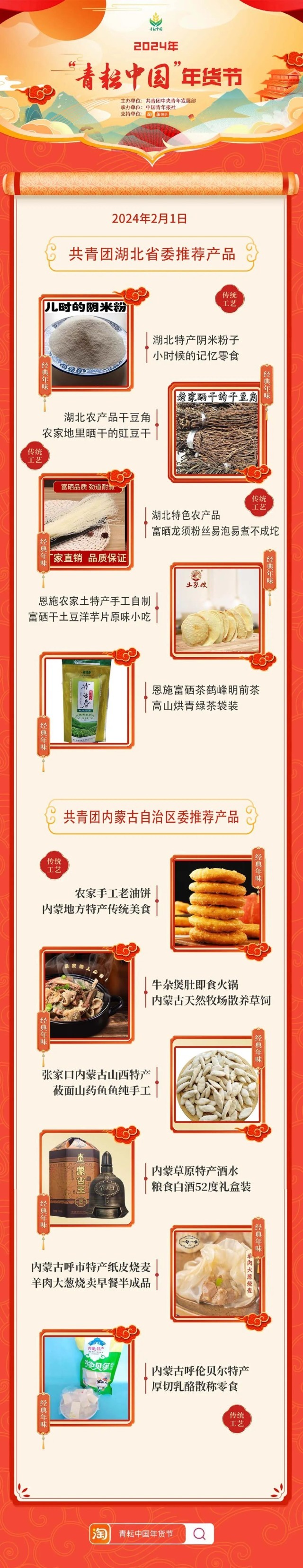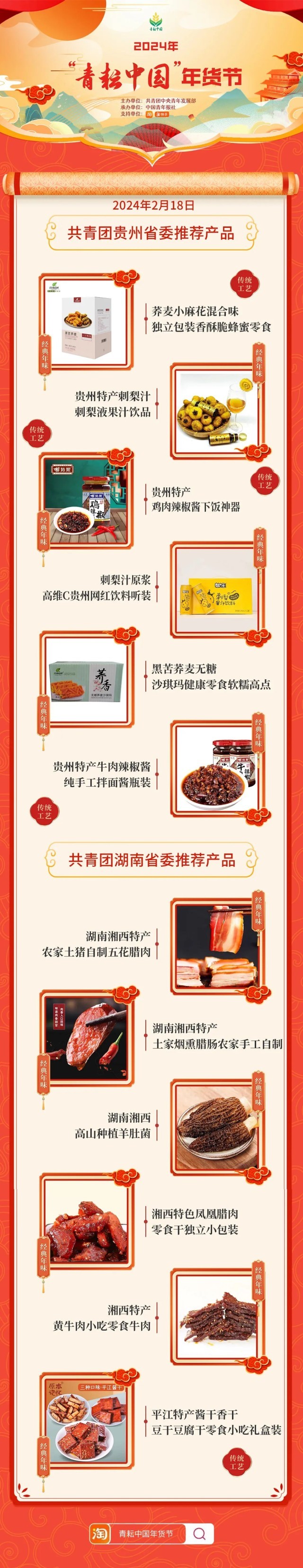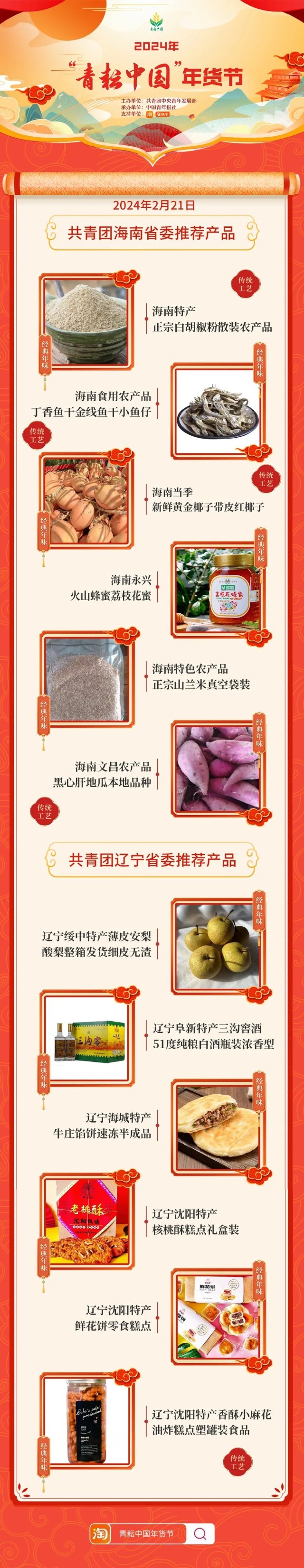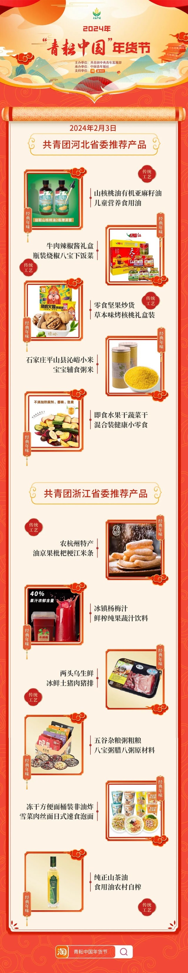 2024年“青耘中国”年货节将于1月31日至2月24日,开展“一日两省”主题日活动。用户可在淘宝APP搜索“青耘中国年货节”进入专题页选购产品。