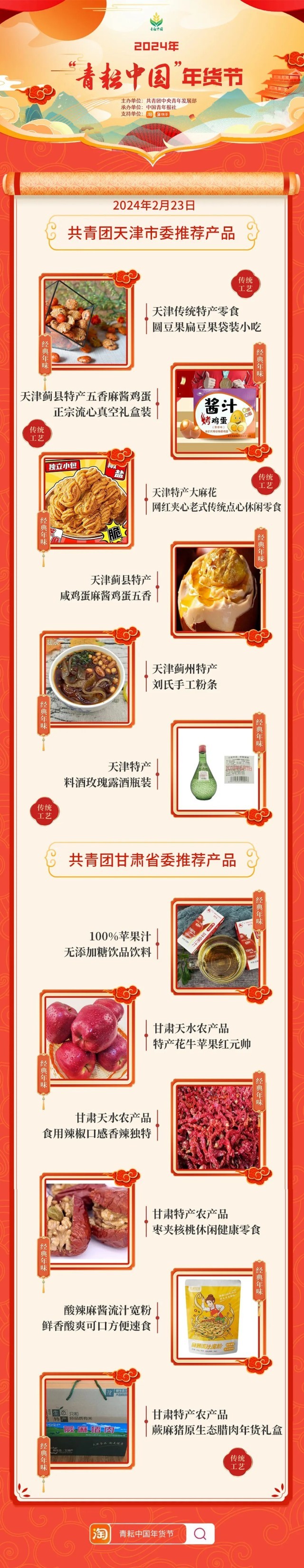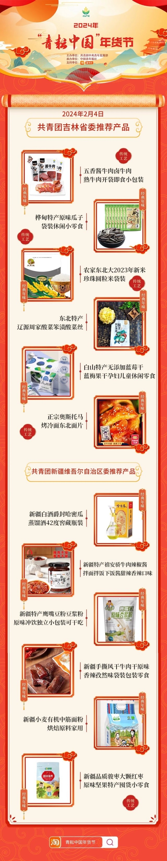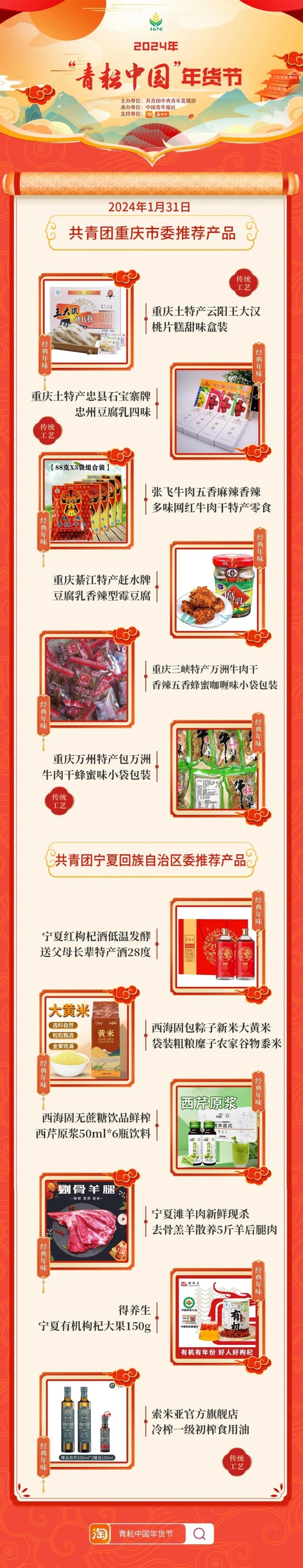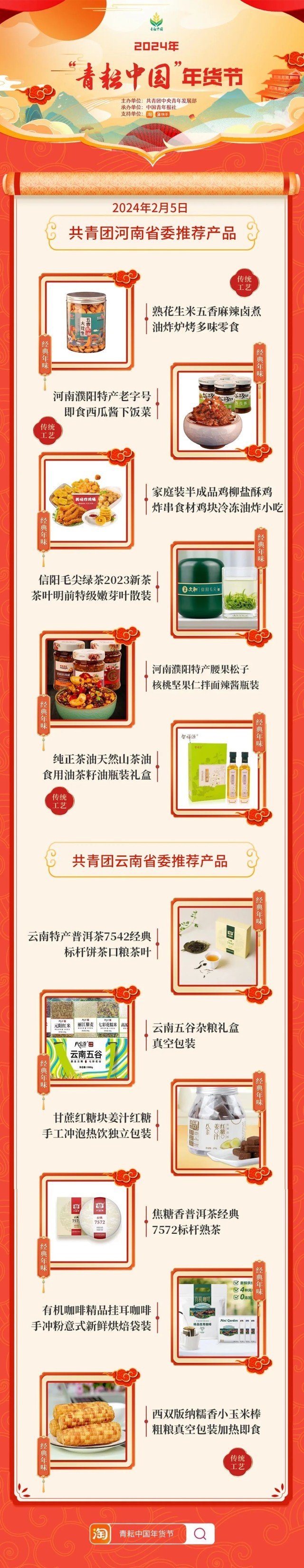 2024年“青耘中国”年货节将于1月31日至2月24日,开展“一日两省”主题日活动。用户可在淘宝APP搜索“青耘中国年货节”进入专题页选购产品。