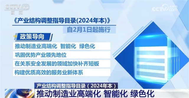 《产业结构调整指导目录(2024年本)》自2月1日起施行。《目录(2024年本)》的政策导向是,推动制造业高端化、智能化、绿色化,巩固优势产业领先地位,在关系安全发展的领域加快补齐短板,构建优质高效的服务业新体系。