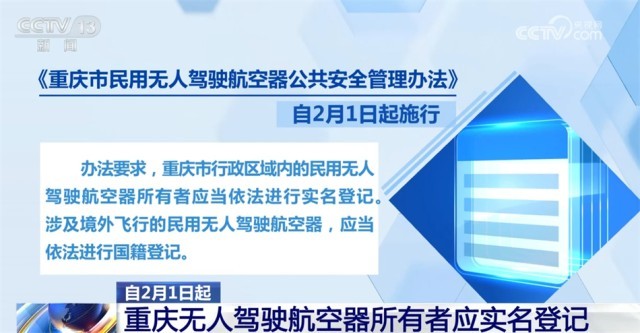 《重庆市民用无人驾驶航空器公共安全管理办法》自2月1日起施行。办法要求,重庆市行政区域内的民用无人驾驶航空器所有者应当依法进行实名登记。涉及境外飞行的民用无人驾驶航空器,应当依法进行国籍登记。