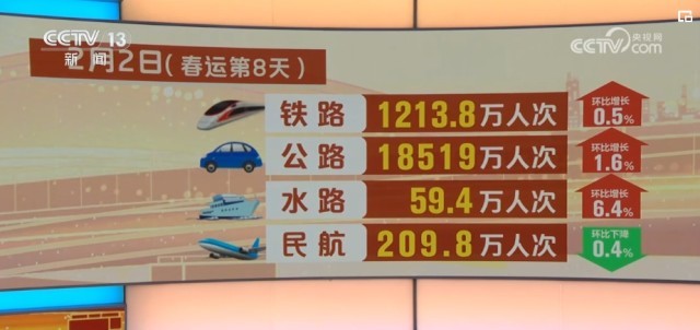具体来看,2月2日,铁路客运量1213.8万人次,环比增长0.5%;公路人员流动量18519万人次,环比增长1.6%;水路客运量59.4万人次,环比增长6.4%;民航客运量209.8万人次,环比下降0.4%。