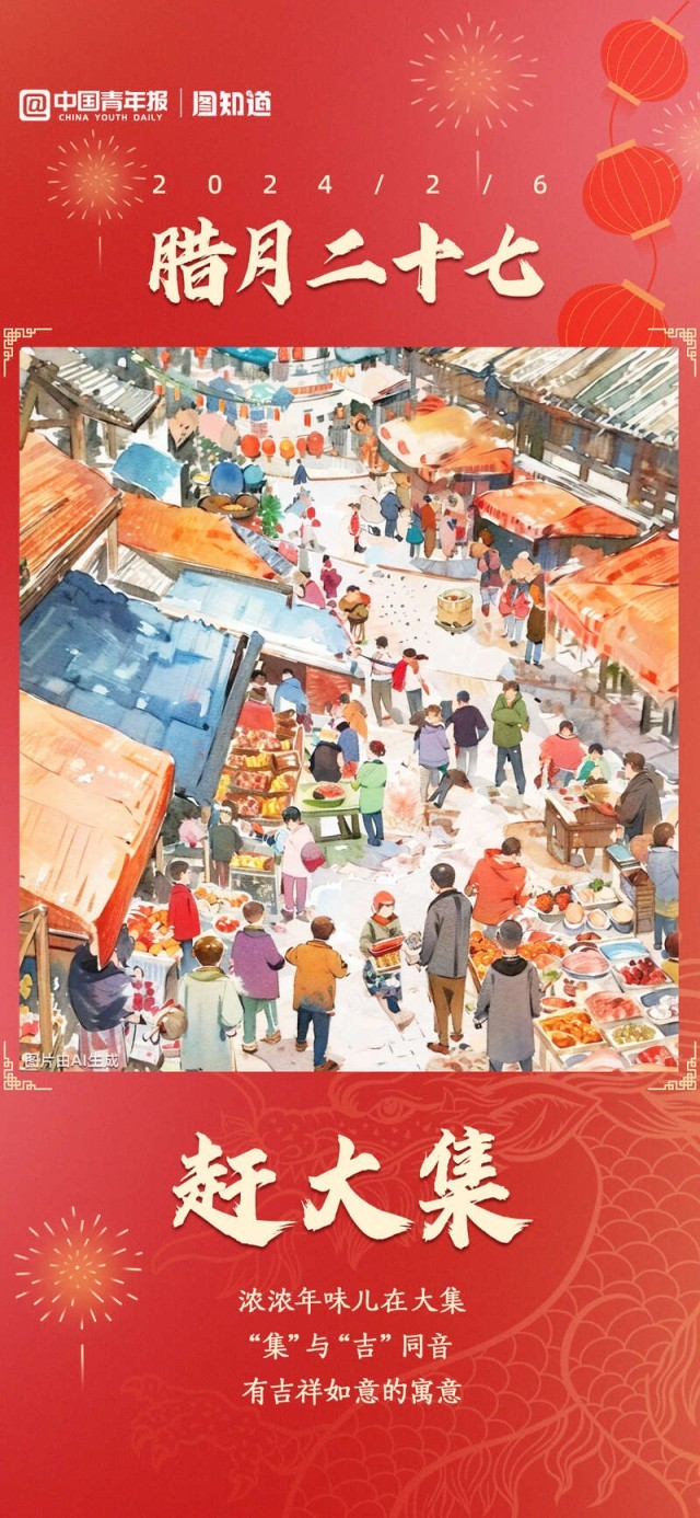 逛集市,品年味儿。腊月二十七,“赶大集”是传统年俗。“集”与“吉”同音,有吉祥如意的寓意。这天的集市格外热闹,春联、灯笼、糖果、玩具、礼品……春节所需物品都在置办之中。今年,你购置了哪些不一样的年货?一起分享。