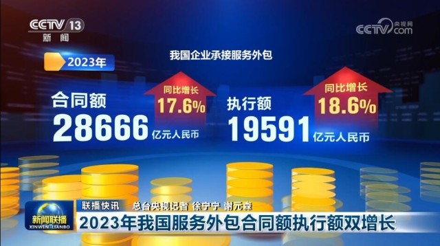 商务部公布的数据显示,2023年我国企业承接服务外包合同额28666亿元人民币,执行额19591亿元,同比分别增长17.6%和18.6%。其中,新能源技术研发服务、检验检测服务、交通工具维修维护服务等离岸服务外包业务增速较快。