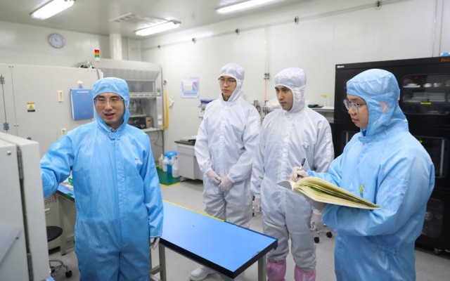 在位于沈阳市的中国科学院金属研究所纳米碳基电子器件超净实验室,孙东明(左一)与指导的研究生一起讨论反应离子刻蚀工艺设备的使用方法和注意事项(2月24日摄)。