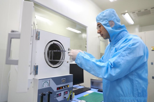 在位于沈阳市的中国科学院金属研究所纳米碳基电子器件超净实验室,孙东明从前处理设备腔体中取出实验样品(2月24日摄)。