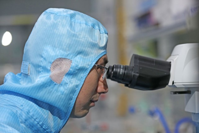 在位于沈阳市的中国科学院金属研究所纳米碳基电子器件超净实验室,孙东明在聚焦光学显微镜前观测实验样品的形貌(2月24日摄)。