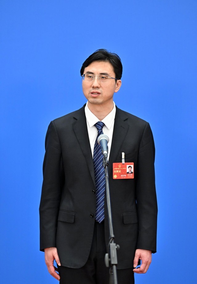 在第十四届全国人民代表大会一次会议举行的第二场“代表通道”采访活动上,孙东明接受媒体采访(2023年3月7日摄)。新华社记者 李鑫 摄
