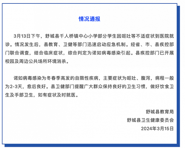 安徽舒城通报一小学多名学生腹痛呕吐:综合判定为诺如病毒感染引起