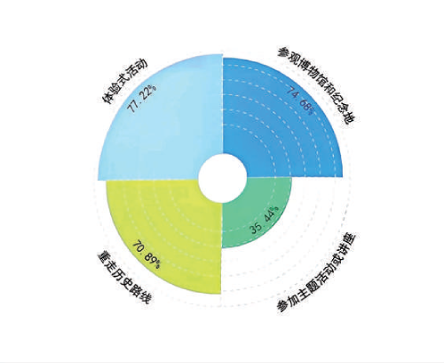 爱国主义教育入耳、入脑,更入心。此次调研中,79.75%的受访者参与过红色旅游,年龄主要集中在18~35岁之间。超过70%的人选择参观博物馆和纪念地(74.68%)、重走历史路线(70.89%)以及体验式活动(77.22%)三种形式,90.87%的受访者表示,参与红色旅游的目的是学习历史文化知识、接受红色文化洗礼。