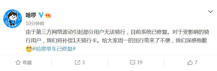 哈啰回应单车崩了:系统已修复 补偿1天骑行卡