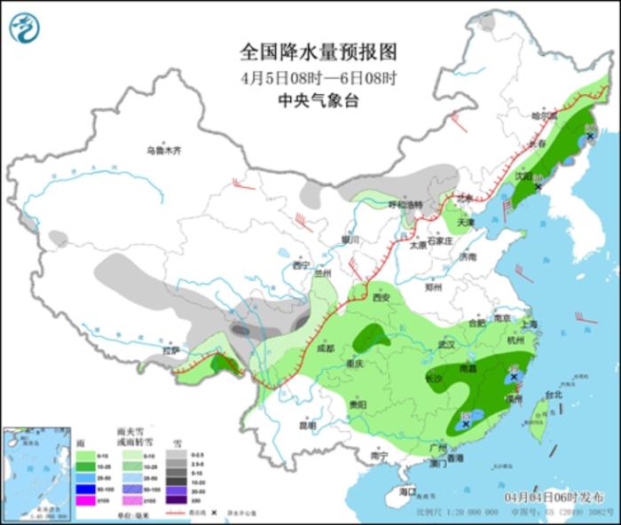 4月5日08时至6日08时,内蒙古中部、西藏北部和东部、青海南部、川西高原等地部分地区有小到中雪或雨夹雪,局地有大雪。东北地区东部和南部、西北地区东南部、江淮西部、江汉、江南、西南地区东部、华南大部、台湾岛等地部分地区有小到中雨,其中,吉林东部、辽宁东部、江西南部、福建北部、广东东北部等地局地有大雨(25~45毫米)。内蒙古中东部、甘肃等地部分地区有4~6级风,其中,甘肃河西部分地区有6~7级风(见图4)。渤海、渤海海峡、黄海中部和东南部海域将有8级、阵风9级的大风,其中渤海和黄海中东部的部分海域风力可达9级、阵风10级。
