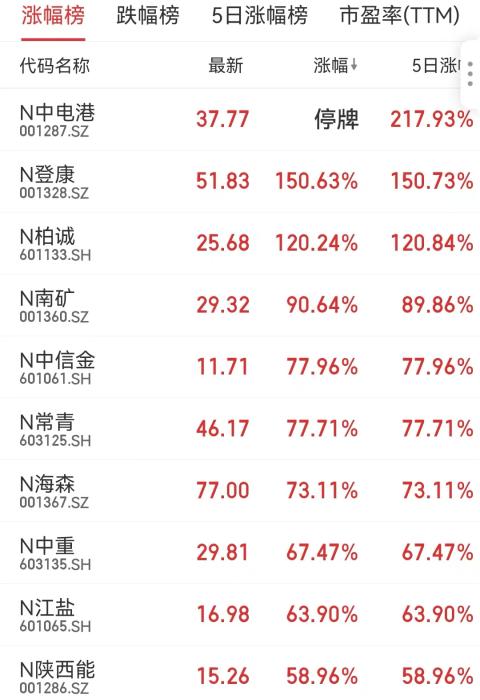 截至发稿时,N中电港停牌,N登康涨幅150.63%,N柏诚涨幅120.24%、N南矿涨幅90.64%,N中信金、N常青、N海森、N中重、N江盐、N陕西能保持强势上涨。
