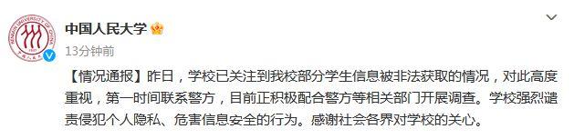 中新网7月2日电 据中国人民大学官方微博消息,昨日,学校已关注到该校部分学生信息被非法获取的情况,对此高度重视,第一时间联系警方,目前正积极配合警方等相关部门开展调查。学校强烈谴责侵犯个人隐私、危害信息安全的行为。感谢社会各界对学校的关心。