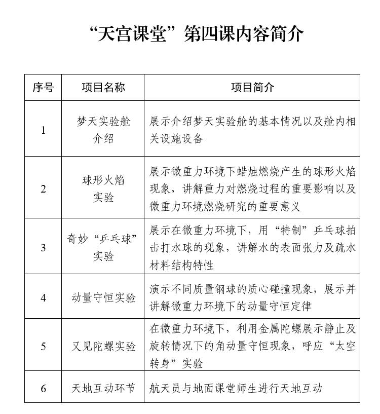 本次太空授课活动继续采取天地互动方式进行。3名航天员将在轨展示介绍中国空间站梦天实验舱工作生活场景,演示球形火焰实验、奇妙“乒乓球”实验、动量守恒实验以及又见陀螺实验,并与地面课堂进行互动交流。