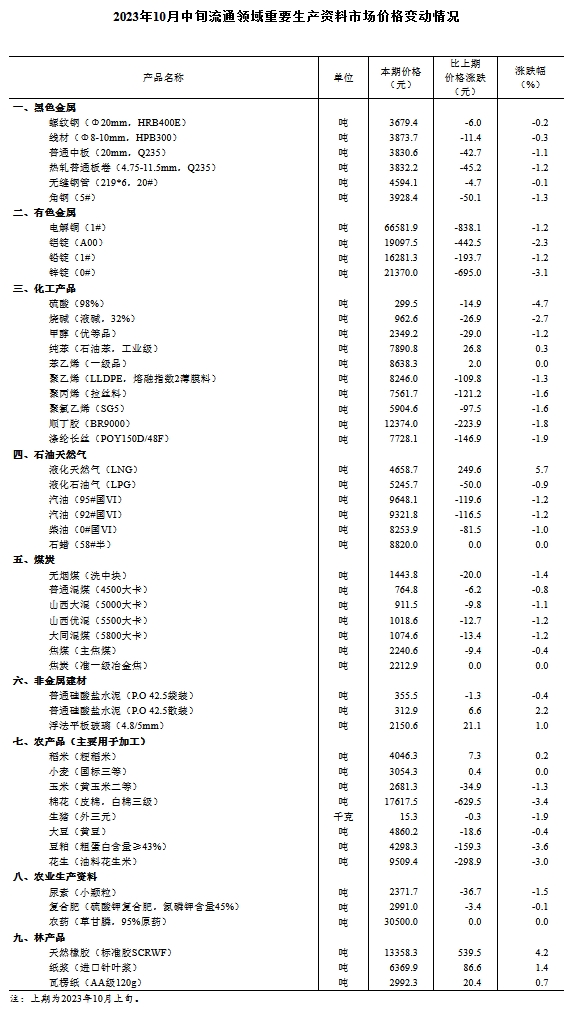 中新网10月24日电 国家统计局网站发布2023年10月中旬流通领域重要生产资料市场价格变动情况。2023年10月中旬与10月上旬相比,8种产品价格上涨,37种下降,5种持平。其中液化天然气(LNG)价格环比涨5.7%,天然橡胶(标准胶SCRWF)价格环比涨4.2%,棉花价格环比跌3.4%,生猪(外三元)价格环比跌1.9%。(中新财经)