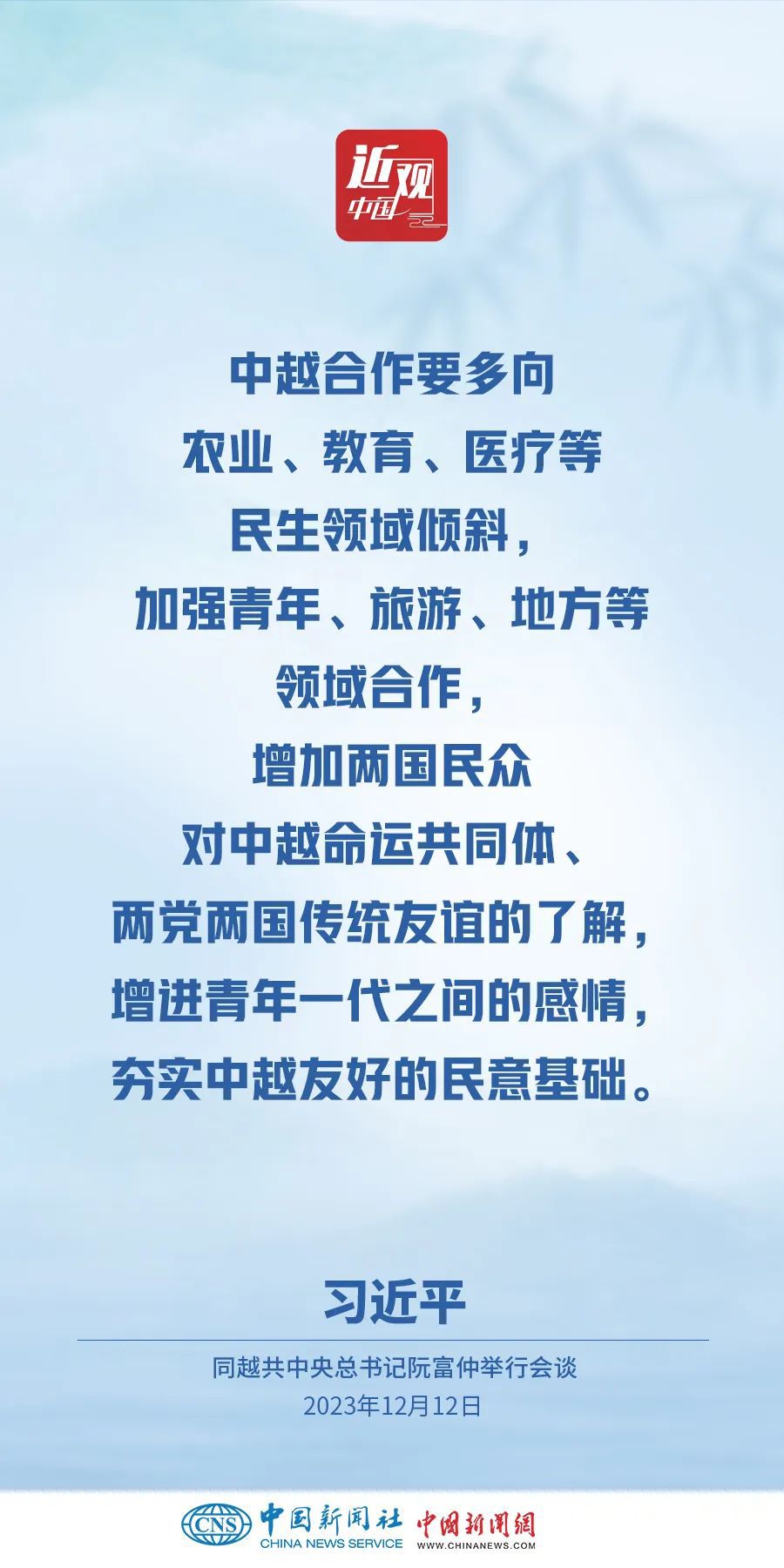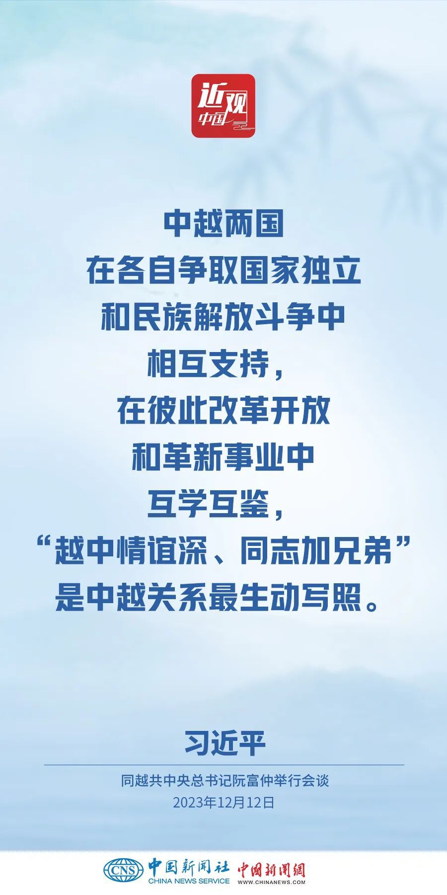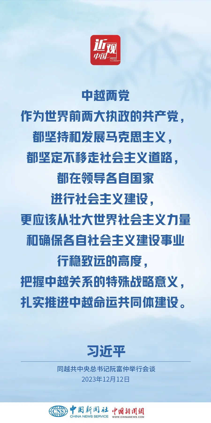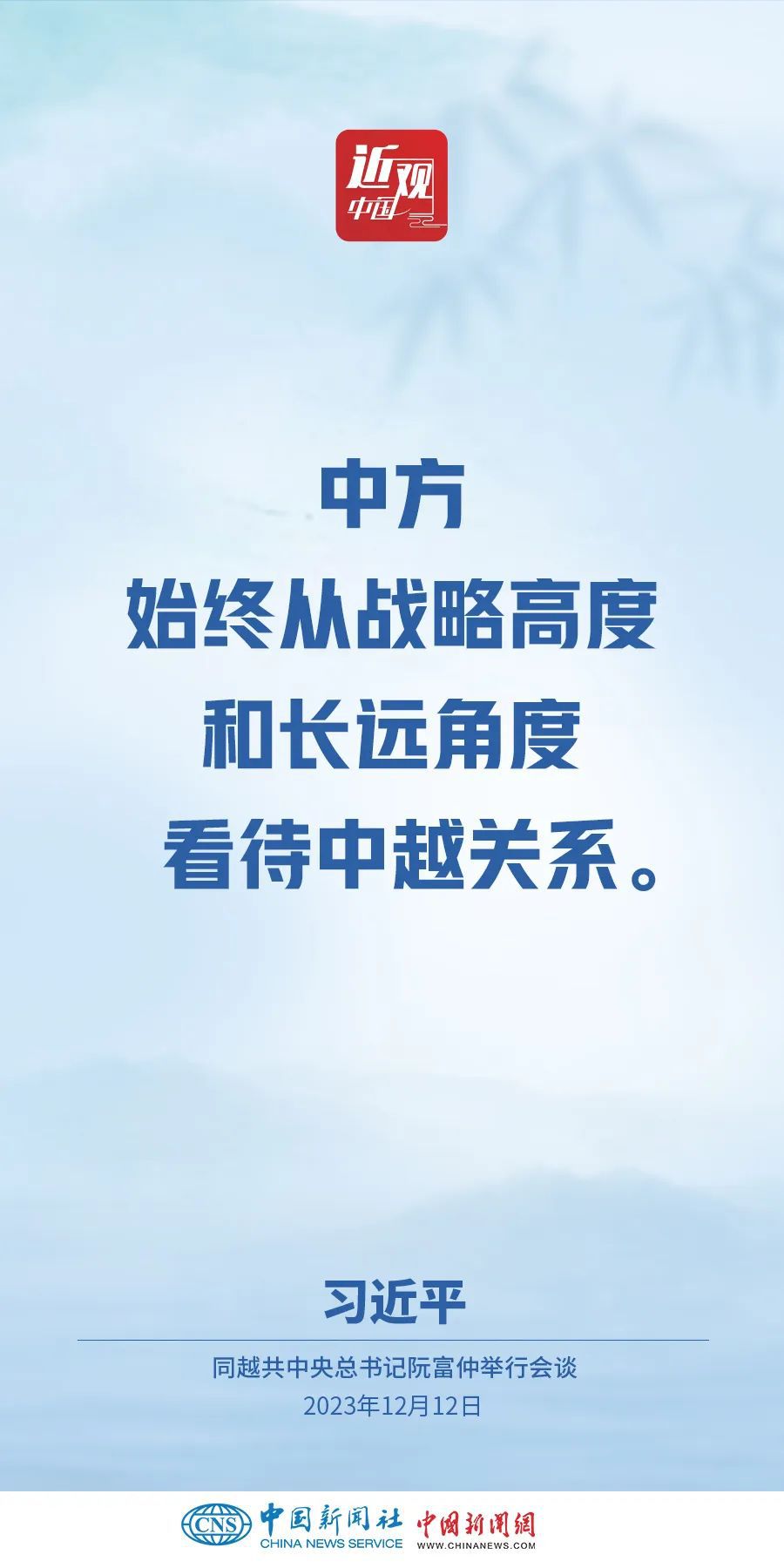 当地时间12月12日下午,刚刚抵达河内的中共中央总书记、国家主席习近平在越共中央驻地同越共中央总书记阮富仲举行会谈。双方宣布中越两党两国关系新定位,在深化中越全面战略合作伙伴关系基础上,携手构建具有战略意义的中越命运共同体。习近平指出——
