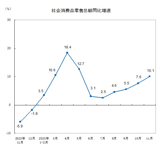 国家统计局:11月份社会消费品零售总额增长10.1%