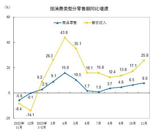 按消费类型分,11月份,商品零售36925亿元,同比增长8.0%;餐饮收入5580亿元,增长25.8%。1—11月份,商品零售380460亿元,同比增长5.9%;餐饮收入47485亿元,增长19.4%。