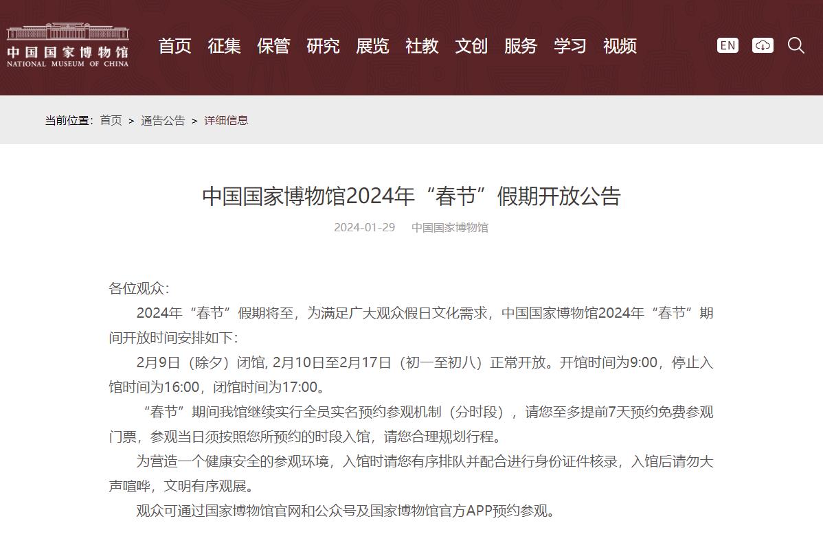 中国国家博物馆:除夕闭馆,初一至初八正常开放