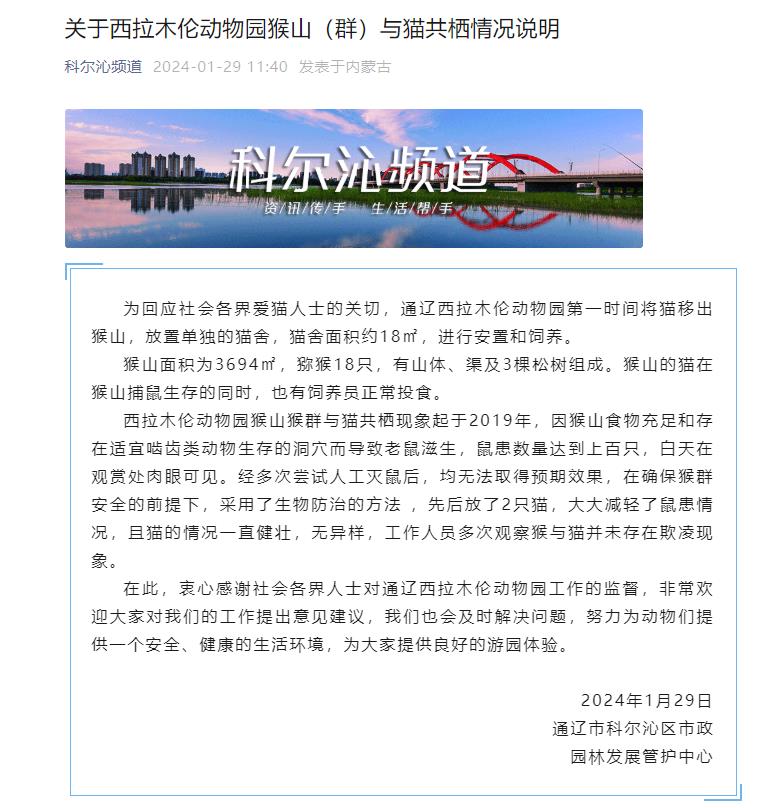 中新网1月29日电 据内蒙古通辽市科尔沁区融媒体中心微信公众号消息,通辽市科尔沁区市政园林发展管护中心29日发布《关于西拉木伦动物园猴山(群)与猫共栖情况说明》(下称“情况说明”)。情况说明显示,通辽西拉木伦动物园已第一时间将猫移出猴山,且猫的情况一直健壮,无异样,工作人员多次观察猴与猫并未存在欺凌现象。全文如下: