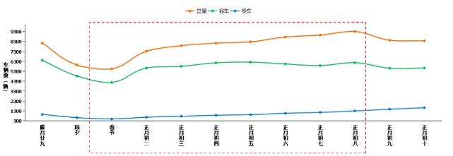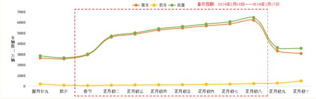 预计春节期间全国高速公路客车日均流量约4890万辆,小客车占客车比例预计达99%以上。货车流量在春节节前逐日下降,在正月初一达到最低值,春节假期之后逐渐恢复到日常水平,但货车流量同比去年预计有所增长。