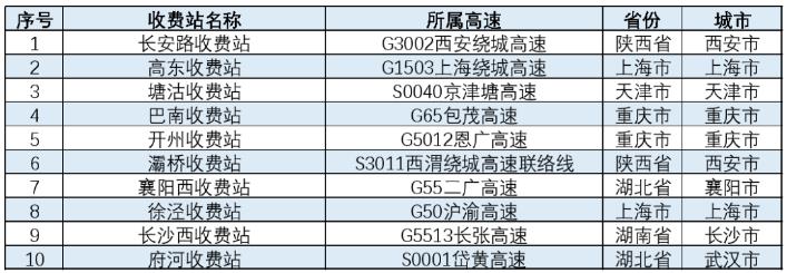 春节期间,全国高速公路预计易发生拥堵缓行的收费站,如下表所示。