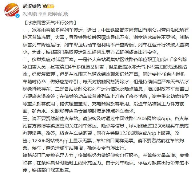 武汉铁路:冰冻雨雪致多趟列车停运,不要贸然前往火车站