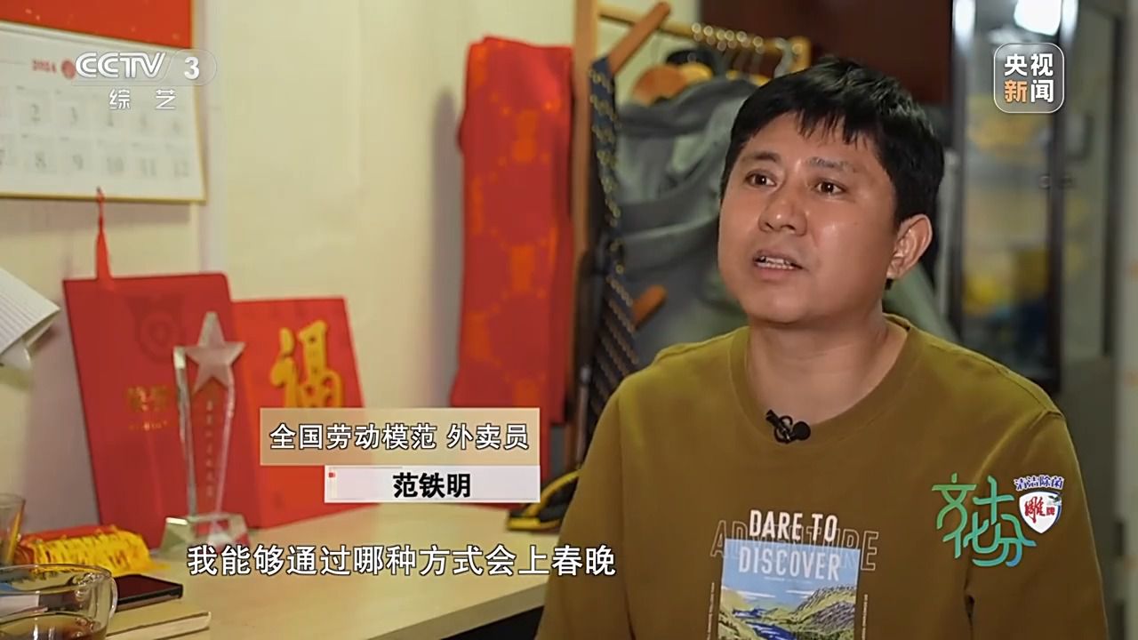 全国劳动模范 外卖员 范铁明:2023年,我被评为全国最美外卖配送员,这个奖项,不单纯是给我个人的,实际上是对新就业群体,对骑手的一个认可。根本就没有想到我能够通过哪种方式会上春晚,因为我又不是专业的演职人员,当时我并不是很相信,我们分配的是《劳动最光荣》,它是一个通过动画片的形式,就是我们儿时都会看一些动画片,动画片里都会有一些主人公,比如说《黑猫警长》当中的黑猫警长,《大闹天宫》里的孙悟空,包括《小猫钓鱼》里头的猫妈妈,当然都是我们当时崇拜的一个对象,最终我们成为或即将成为他们。