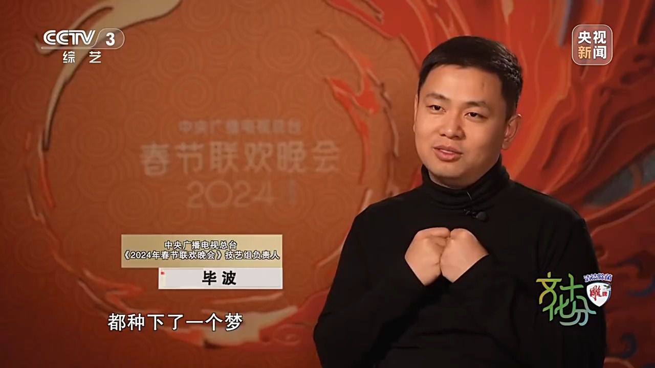 中央广播电视总台《2024年春节联欢晚会》技艺组负责人 毕波:我们童年看到的很多文艺作品,其实在我们心中都种下了一个梦,过去了二三十年它开始生根发芽。研究蛟龙号的这些科研人员,他们小时候也看《哪吒闹海》,我们甚至邀请了航天员去唱这首歌,他们小时候看的是《大闹天宫》,现在他们人就在天宫,这是一个多么美妙的实现圆梦的故事。