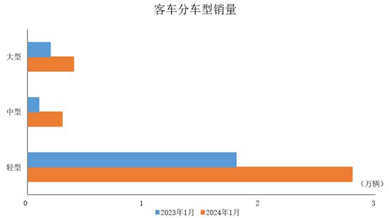 2024年1月,客车产销均完成3.5万辆,环比分别下降35.3%和36.5%,同比分别增长68.1%和63.4%。在客车细分品种中,与上月相比,三大类客车品种产销均呈两位数下降;与上年同期相比,三大类客车品种产销均呈不同程度增长。
