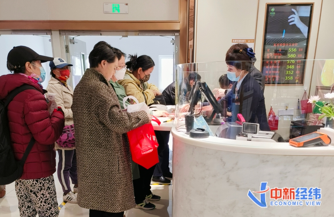 中新经纬3月21日电 (马静 李自曼 魏薇)“唰唰唰……”两台点钞机的声响此起彼伏,几位大妈从布口袋里拿出整整齐齐的几叠现金放到收银台面上,三位收银员正忙着点钞、核对小票。这是3月21日早晨十点半左右,北京菜市口百货四楼投资金条柜台前的一幕。