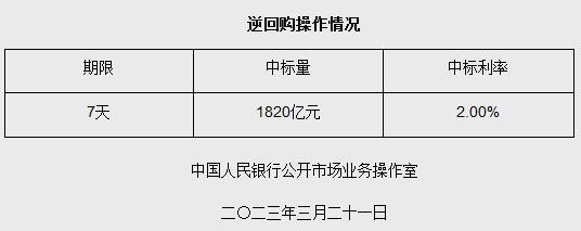 央行3月21日开展1820亿元7天期逆回购操作