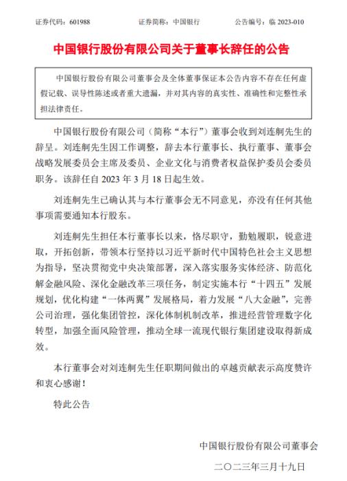 另外,19日,中国银行公告称,刘连舸因工作调整,辞去董事长、执行董事、董事会战略发展委员会主席及委员、企业文化与消费者权益保护委员会委员职务。