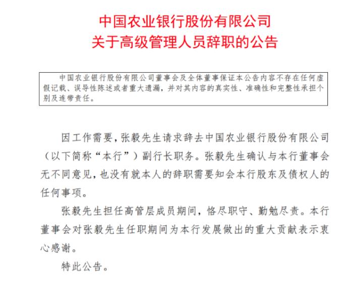 中国农业银行也人事变动不断。21日,农行公告称,因工作需要,张毅请求辞去中国农业银行副行长职务。