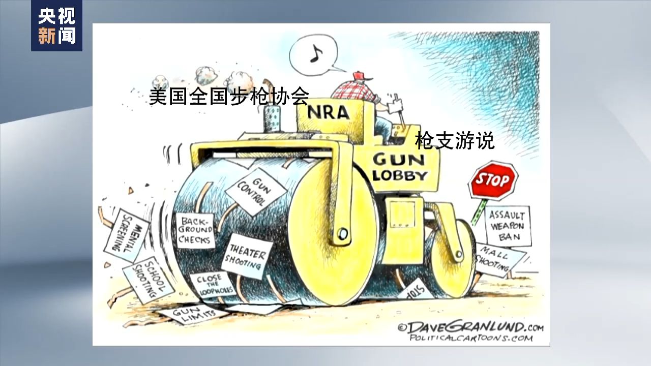 在这幅漫画中,一名男子听着音乐,漫不经心地开着一辆写有“美国全国步枪协会”、“枪支游说”字样的压路机一路向前,撞倒了前方赫然在目的“停止”标志。在他身后,“攻击性武器禁令”、“控枪”、“背景调查”等标志被一一碾压,接二连三发生的“校园枪击”、“剧院枪击”、“商场枪击”等惨痛事件也完全被无视。