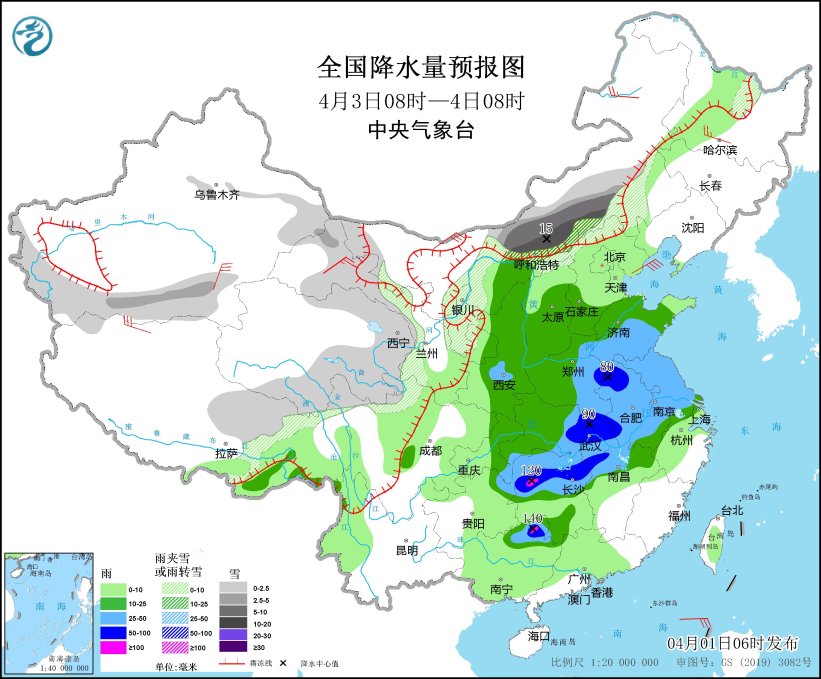 明天开始,大范围雨雪将铺展开来,内蒙古河套地区、西藏东部、西北地区东部、华北南部和西部、黄淮西部、江汉、江南北部、西南地区东北部等地部分地区有中到大雨,其中,河南南部、湖北北部和南部、湖南北部等地部分地区有暴雨或大暴雨。预计本轮雨雪天气过程主要出现时段在4月2日至4日。