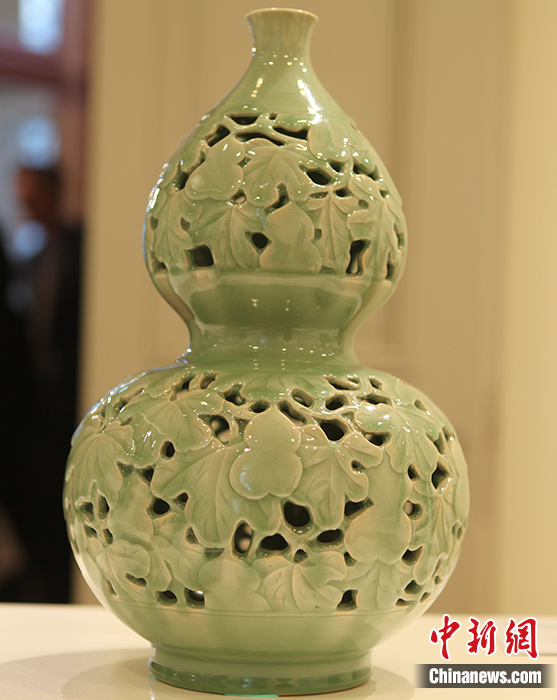 图为展品《葫荫绵长》,因其烧制难度大,是公认的龙泉青瓷精品。 中新社记者 德永健 摄