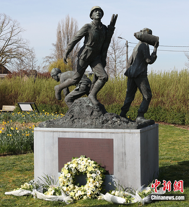 图为在波普林格一战华工纪念园,一战华工纪念雕像前摆放着花环花束。 中新社记者 德永健 摄