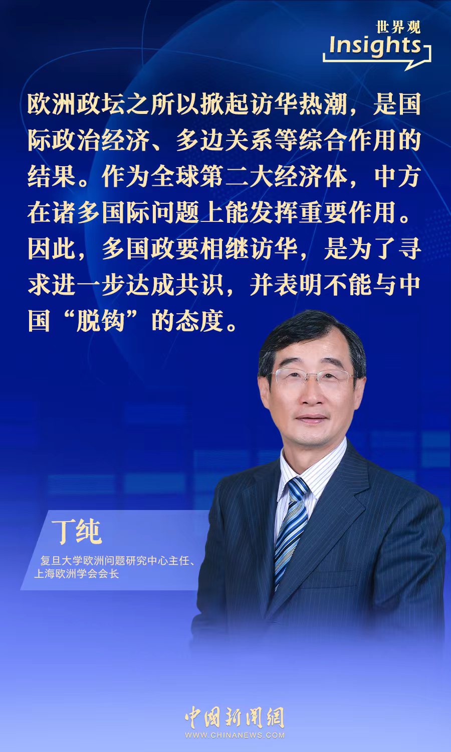 中新网4月7日电(甘甜)近日,复旦大学欧洲问题研究中心主任、上海欧洲学会会长丁纯接受中新网采访时表示,中国在诸多国际问题上能发挥重要作用,欧洲多国政要相继访华,是为了寻求进一步达成共识,并表明不能与中国“脱钩”的态度。