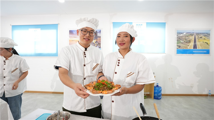 4月6日,柬埔寨新金边国际机场项目建设现场,刘晓仙(左)和曼玉良在中国建筑(柬埔寨)职工厨王争霸赛上展示“中建(柬)一家亲”炒米粉。中国建筑供图