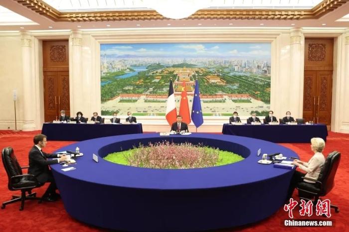 4月6日下午,中国国家主席习近平在北京人民大会堂同法国总统马克龙、欧盟委员会主席冯德莱恩举行中法欧三方会晤。中新社记者 盛佳鹏 摄