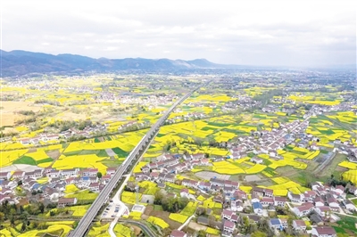 陕西省汉中市南郑区岳家岭村,一列动车组列车在金灿灿的油菜花海中穿行。