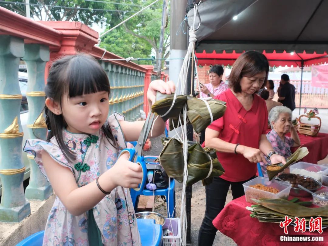 2023年6月18日,马来西亚马六甲举行端午龙舟系列活动,包括游龙舟、裹粽比赛等,吸引当地各族裔民众参与。图为有的家庭四代同堂齐上阵。奶奶在一旁包粽子,四岁的曾馨怡小朋友给包好的粽子修剪粽叶。陈悦 摄