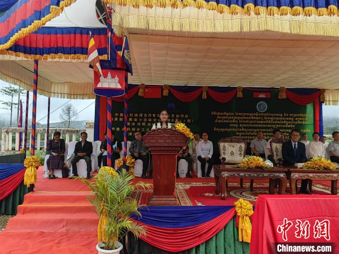 当地时间6月18日,“澜湄国家典型小流域综合治理示范(三期)”项目俄勒塞村成果移交仪式在柬埔寨国公省莫邦县举行。图为中国驻柬埔寨大使馆公使衔参赞赵海燕致辞。 中新社记者 杨强 摄
