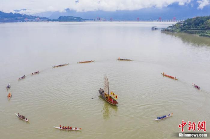 2021年10月,中国龙舟争霸赛在湖北秭归县徐家冲港湾国家级龙舟训练基地举行,图为龙舟游江仪式。聂爽 摄