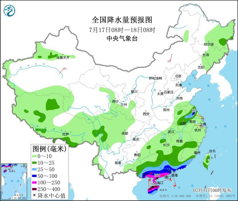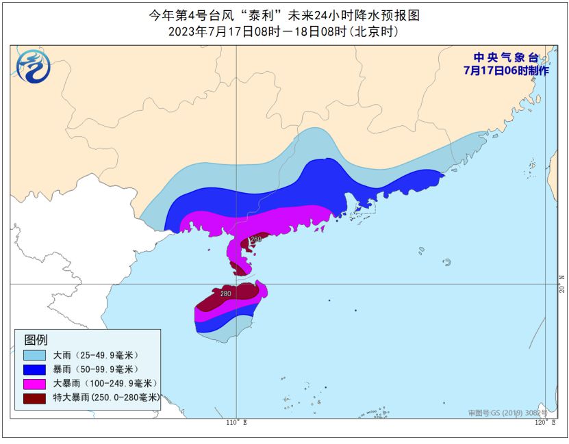 同时,广东西部和南部、广西中南部、海南岛、福建南部等地部分地区有大到暴雨,其中,广西南部、广东西南部、海南岛中北部等地部分地区有大暴雨,广东西南部沿海、海南岛北部等地局地特大暴雨(250~280毫米)。