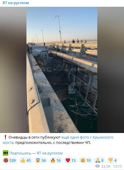 俄媒“今日俄罗斯”(RT)发布了据称是目击者在克里米亚大桥事件后拍摄的大桥图片。图片来源:RT社交媒体截图