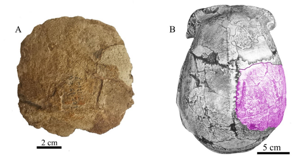周口店第15号地点发现的人类顶骨化石。左侧:顶骨化石外侧面观;右侧:周口店直立人头盖骨模型顶面观,示顶骨化石位置。图片来源:中国科学院官网